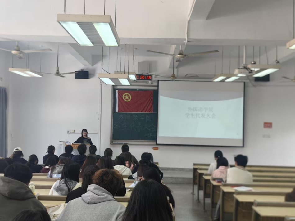2025年10月23日,汉口学院外国语学院第九次学生代表大会在学院一号教学楼1201教室顺利召开。学院党总支书记彭璇、分团委书记廖祉沐、学院全体辅导员与学生代表共同参会。此次大会由外国语学院团学联主席胡星月同学主持。