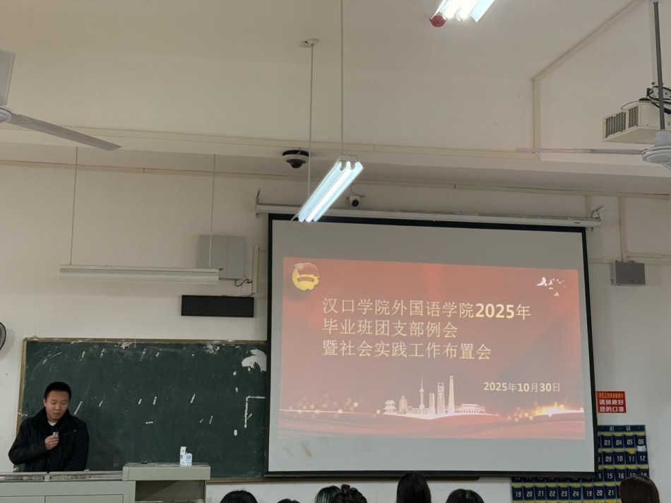 2025年10月30日中午12:10,汉口学院外国语学院在二号教学楼顺利召开了2025年外国语学院毕业班团支部例会暨社会实践工作布置会。此次会议主要对毕业班各团支部近期工作进行梳理与总结,同时对即将上交的大学生社会实践手册进行讲解和相关要求的传达。会议的召开旨在确保毕业生的社会实践工作顺利进行,为他们顺利完成毕业生各项准备工作提供支持。