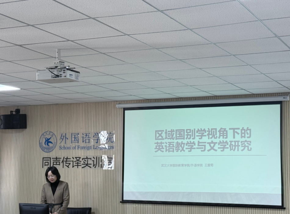 2025年11月21日下午,武汉大学国际教育学院院长王爱菊教授应邀莅临汉口学院外国语学院,在三教3408作题为《区域国别学视角下的英语教学与文学研究》的学术讲座。外国语学院院长甘文平、教学副院长付小玲、科研副院长曹梦月、外国语学院各科研团队的老师们及对讲座主题感兴趣的学生们聆听了本场讲座。讲座由科研副院长曹梦月主持。